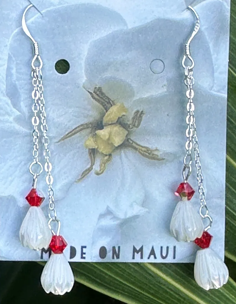 Sterling Silver Mother of Pearl Pīkake Swarovski Crystal Chain Earrings .925 Sterling Silver Swarovski Crystal Siam Red Mother of Pearl Pīkake carved jasmine beads Handmade on Maui