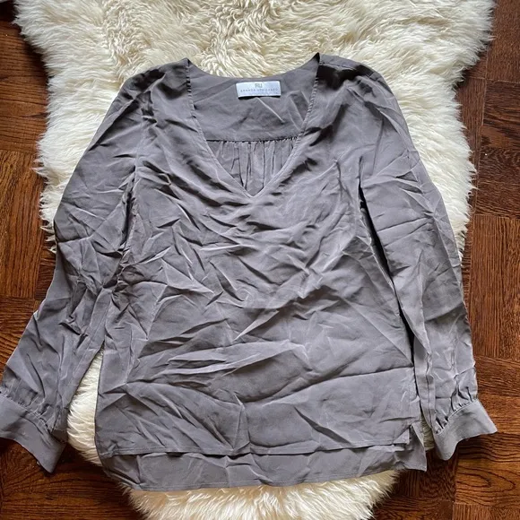 Excellent condition Amanda up Richard 100% silk top in a size small. Side vents. Wide V-neck. Sleeve... Show more