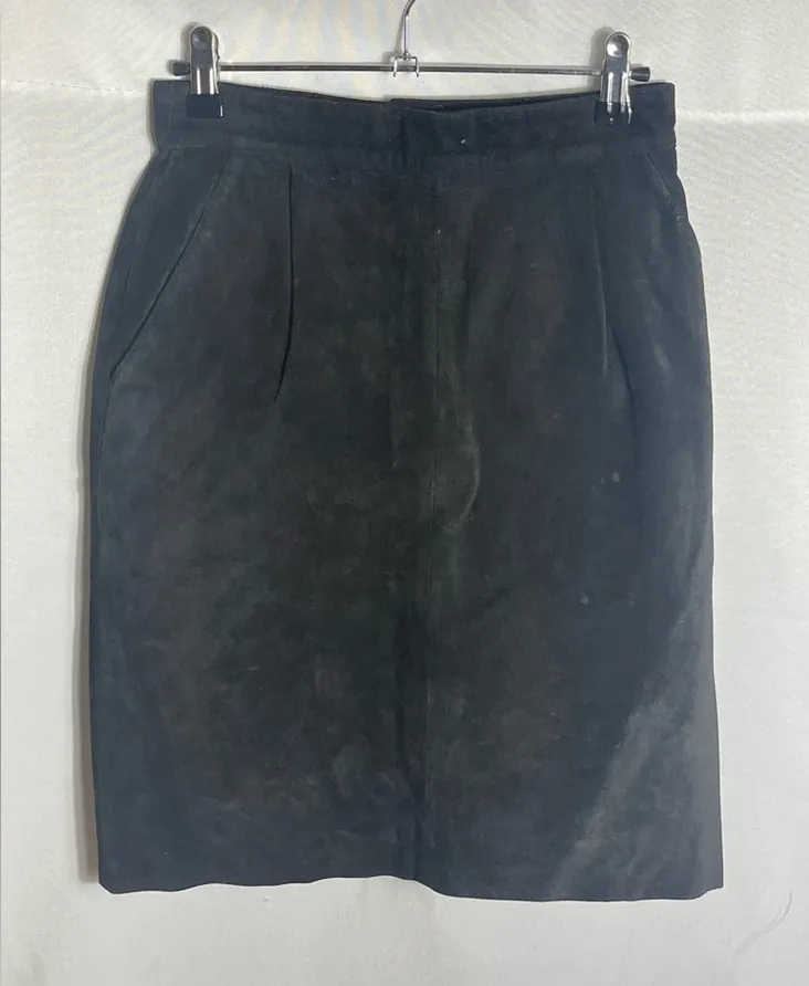 Timeless vintage Toffs black suede pencil skirt, crafted from 100% pig suede with a smooth nylon/acetate lining for comfort. Features pleated front details, side pockets, and a tailored silhouette. Back button and zipper closure with an additional buttoned welt pocket. A versatile piece that transitions effortlessly from workwear to evening style. Details: • Brand: Toffs • Color: Black • Material: 100% Pig Suede (Shell), 50% Nylon / 50% Acetate (Lining) • Style: Pencil skirt • Features: Front pleats, side pockets, back button/zip closure, buttoned welt pocket • Measurements (approx.): • Waist: 13” flat (26” around) • Length: 22” • Size: Small (fits like a 2–4 based on measurements) • Condition: Good vintage condition, suede shows some natural wear consistent with age Tagged: No modern tag, fits Small (2–4) Waist: 13” flat Length: 22” Vintage (likely 1980s–1990s based on style and tags) Pre-owned, suede shows mild age-related wear but overall good vintage condition. #VintageStyle #SuedeSkirt #ClassicWardrobe #TimelessFashion #PencilSkirt