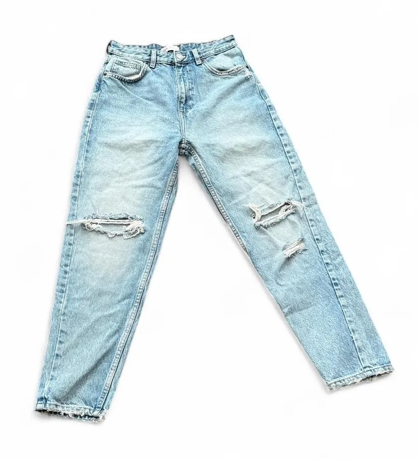 Brand: ZARA Style: High Rise Distressed Mom Jeans Color: Light Wash Features: • High rise • Vintage-... Show more