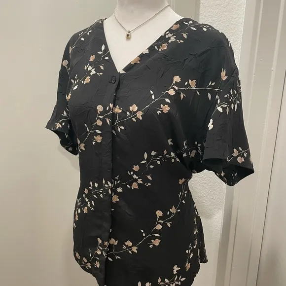 Vintage 1990s Whimsygoth Norton McNaughton Black & Cream Button-Down Floral Printed Short Sleeve V-N... Show more