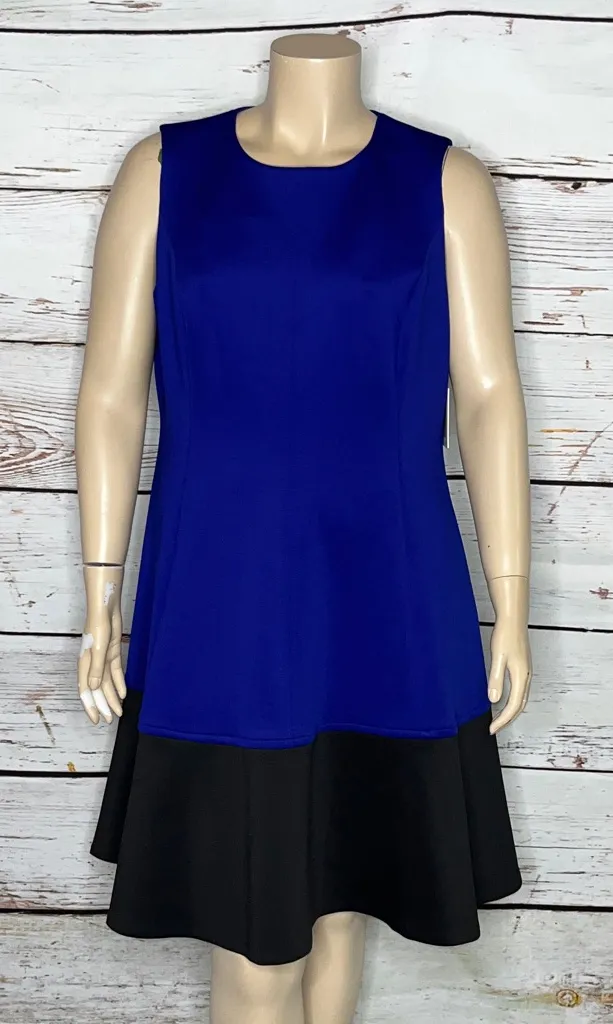 Calvin Klein Size 18W Blue & Black Colorblock Scuba Knit Fit & Flare Dress. Back Clasp with Zipper C... Show more
