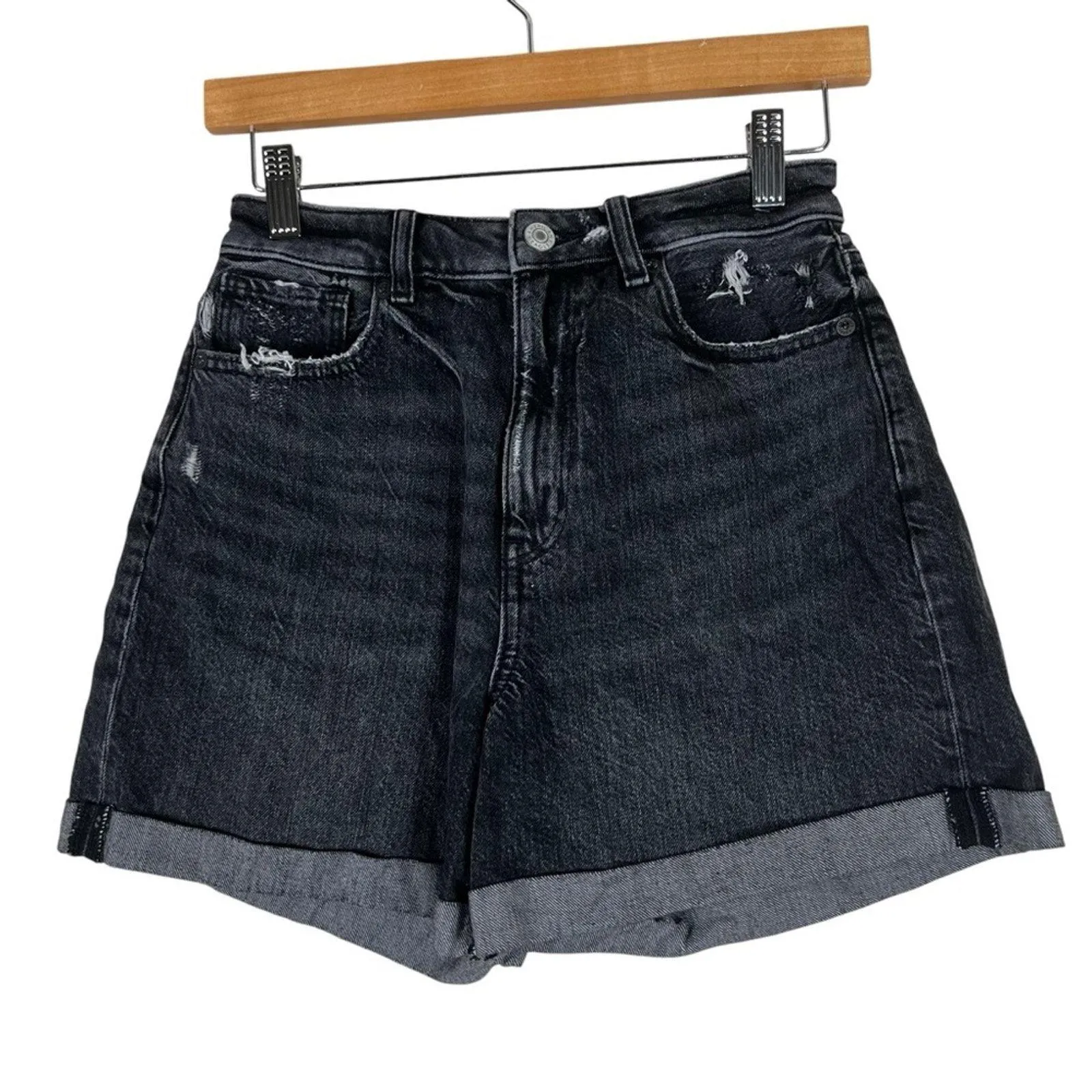High rise Button fly Distressed Raw hem Whiskering Comfort stretch waistband Relaxed fit *measureme... Show more