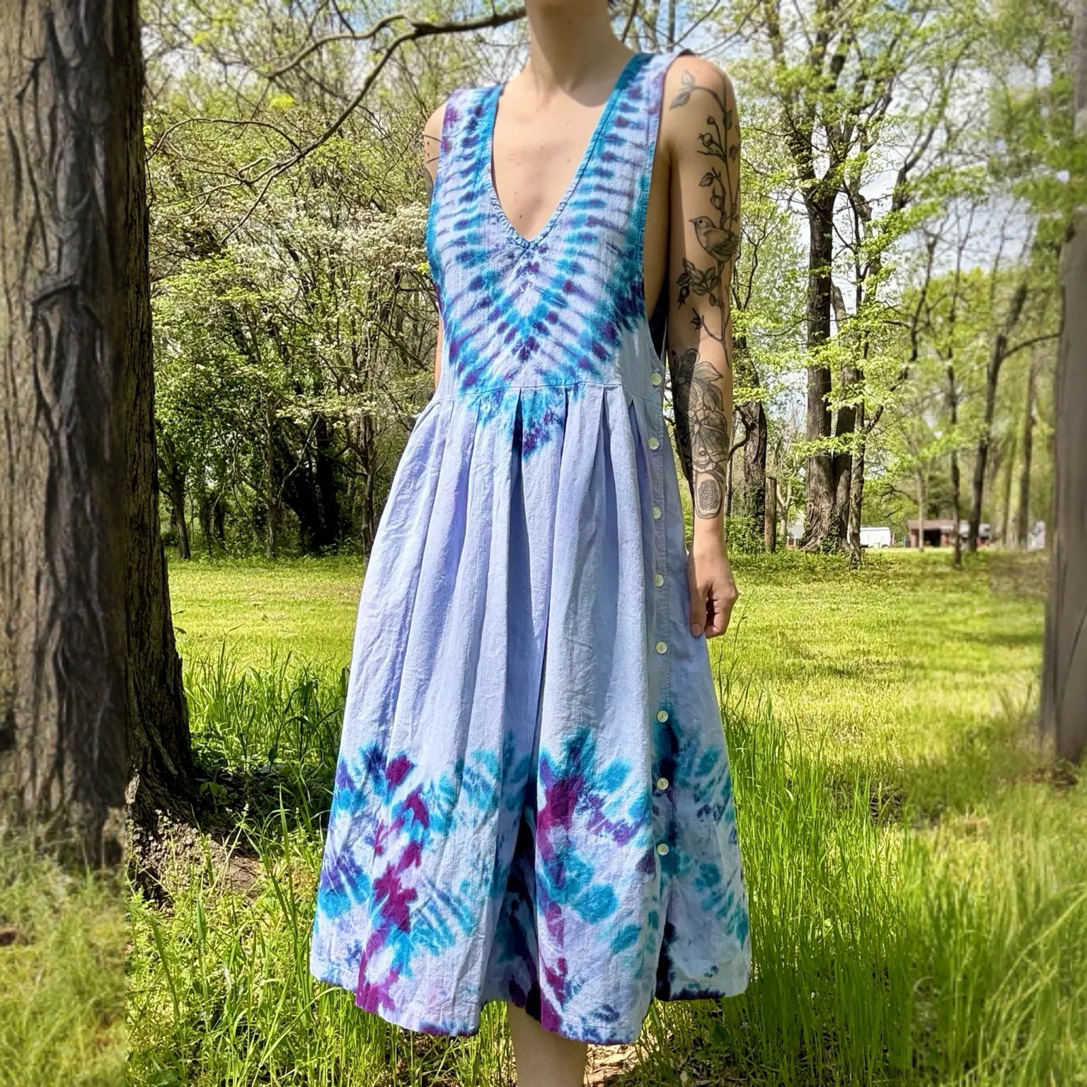 This is a GOOD one! Hand-dyed late 1970s Ms. Paquette California purple & blue side button closure gathered waist midi dress with deep sides and v-neck! 100% cotton and feels AMAZING! Maximalist Lagenlook style! Made on USA. A coupe of yellow-ish spots, but could be from the dye process. Really great vtg condition! Size Medium, shown on size small/6 (5ft8in) and a bit large! Flat measurements PTP free Waist 17.5” Length 47.5”