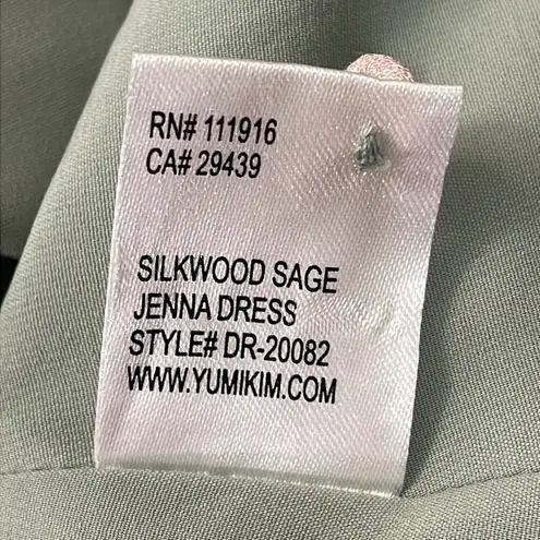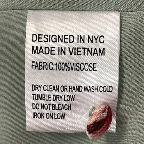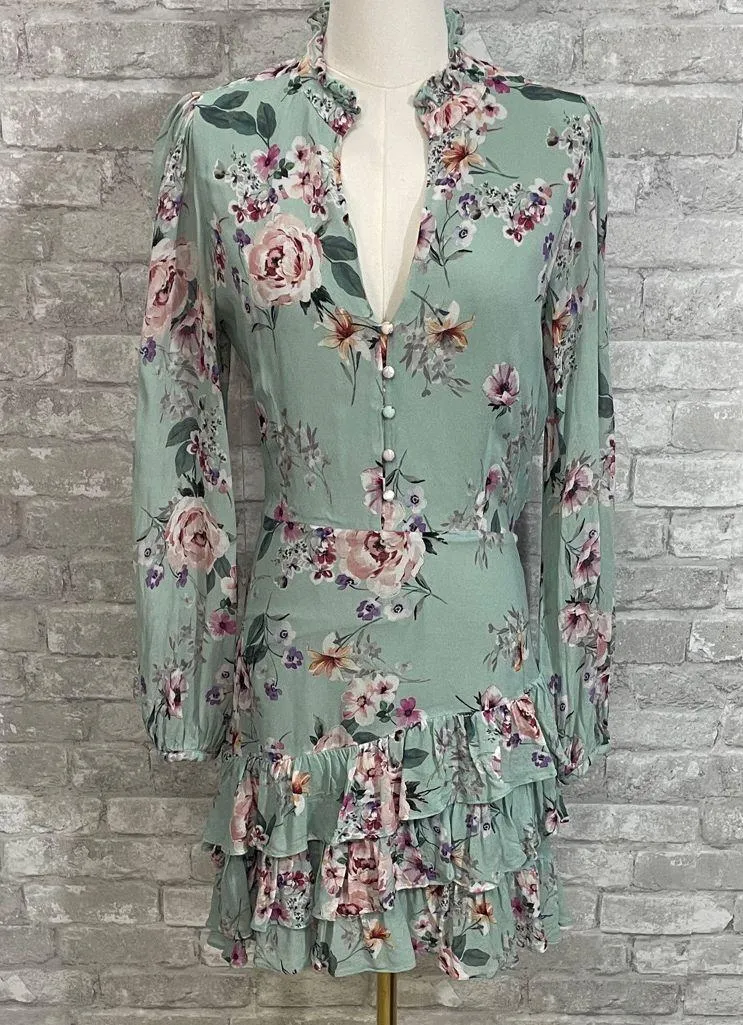 Chic floral dress with ruffled skirt. Features long sleeves and buttoned front. Ideal for versatile styling. FLAW - neck tie was removed Jenna Mini Dress in silkwood sage with ruffled mock collar, button cuffs, and tiered ruffle skirt Length- 33”