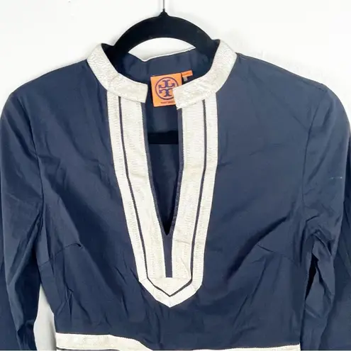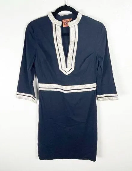 TORY BURCH Megan Navy Blue Silver Metallic Trim V-Neck 3/4 Sleeves Side Zipper Closure Kaftcan Dres... Show more