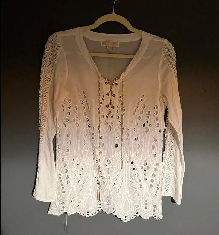 Stunning Michael Kors long sleeve white blouse. Eyelet like fabric design. Gold chain lace up detail... Show more