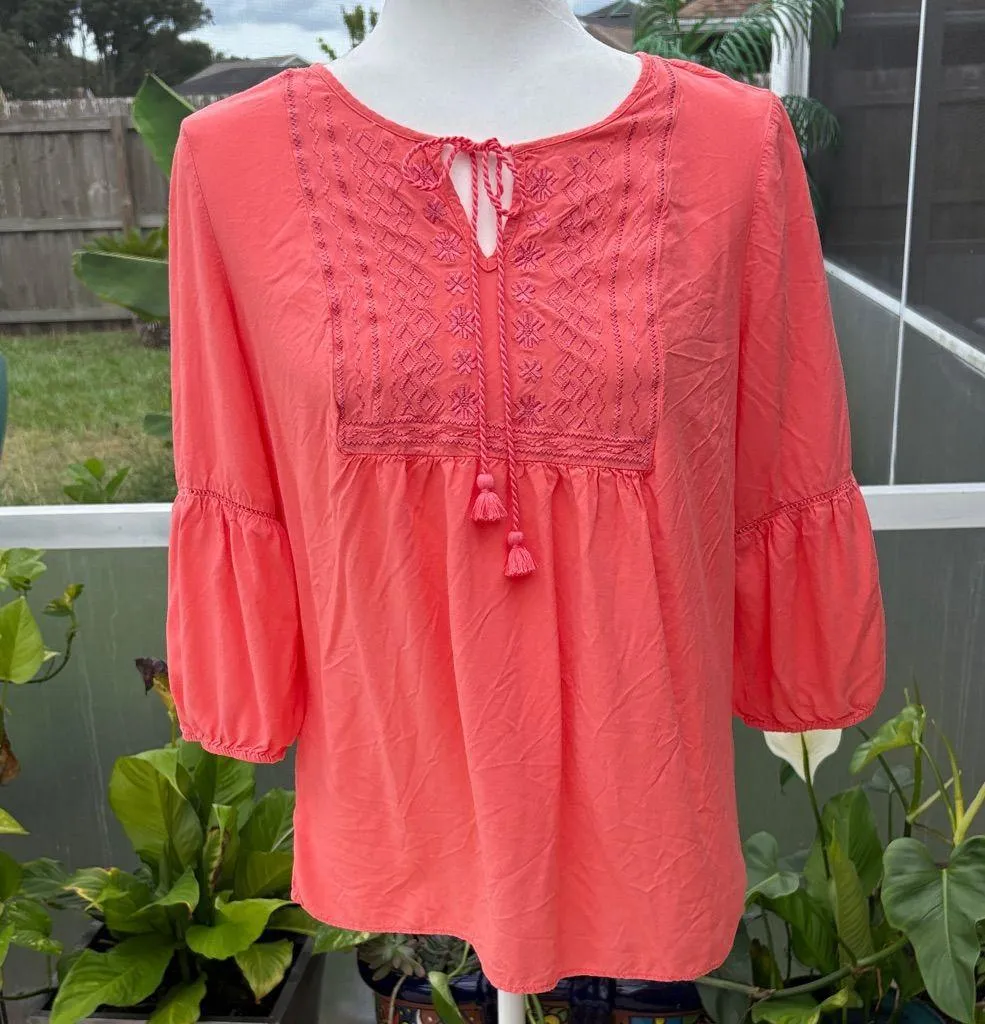 Elevate your style with this elegant coral embroidered top. Perfect for any occasion, this top featu... Show more