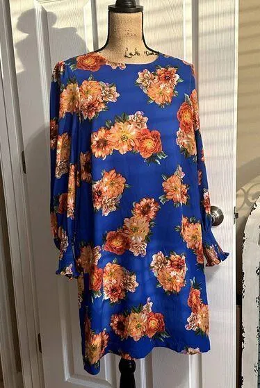 GIBSON LATIMER Women’s Shift Dress Size L Blue Orange Floral Smocked Cuff Lined Size L - $45 New With Tags - From Louise