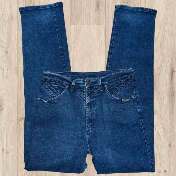 Measurements (laying flat): Waist- 15” across (x2= 30” waist) Rise- 13” Inseam- 33” Leg Opening- 7.5” across Features: - Ultra High Rise - Vintage 80s look - Two front pockets - No back pockets - Stretch denim - Dark Wash - Button closure with zipper fly - Roughrider logos
