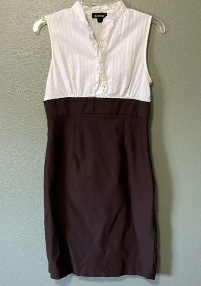 A. Byer sleeveless dress with ruffled button top and brown darted skirt with back vent. Includes a hidden side zipper and a replacement button. Size: Juniors 13 Color: Bodice is cream; skirt is brown Flaws: Normal wear, some discoloration inside the collar. Approximate flat measurements: shoulder to shoulder 13 inches underarm to underarm 16 inches total length 36 inches C1B012013