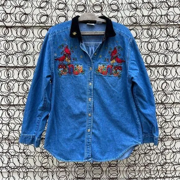 Vintage 90s Bobbie Brooks Ugly Granny Christmas chambray button front shirt with western Americana embroidered presents mistletoe and cardinals black velvet collar trim 100% cotton size large flat measurements are approximate pit to pit 22 inches shoulder to hem 29 inches shoulder seam to wrist 22 1/2 inches