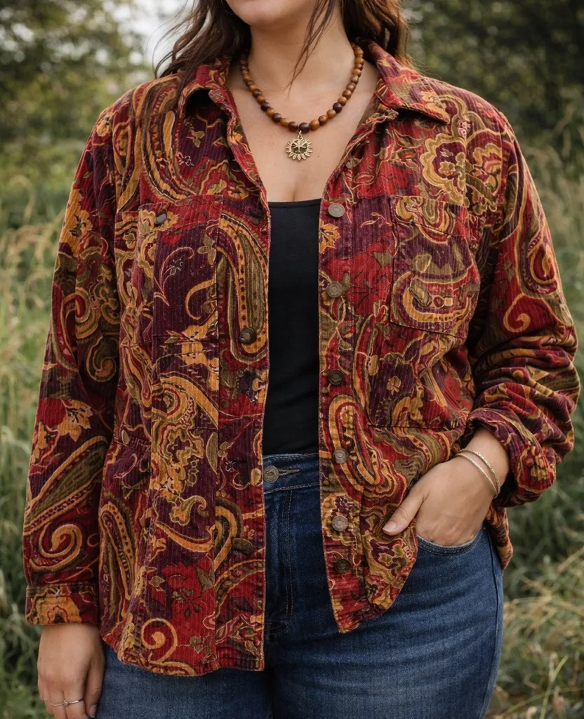 CJ Banks, Size 1X Earthy boho jacket in a soft corduroy with an allover paisley and floral print. Rich fall tones of burgundy, rust, olive, and mustard. Button-front closure with collared neckline. Side pockets. Relaxed, slightly boxy fit that works as a lightweight jacket or shirt jacket. Perfect layered over a tee, tank, or lightweight sweater for an artsy, bohemian look. Material: 100% cotton. Care: Machine wash cold with like colors, gentle cycle. Tumble dry low or hang to dry. Excellent pre-owned condition. Sboho jacket, paisley corduroy, art teacher style, earthy bohemian, fall layering jacket