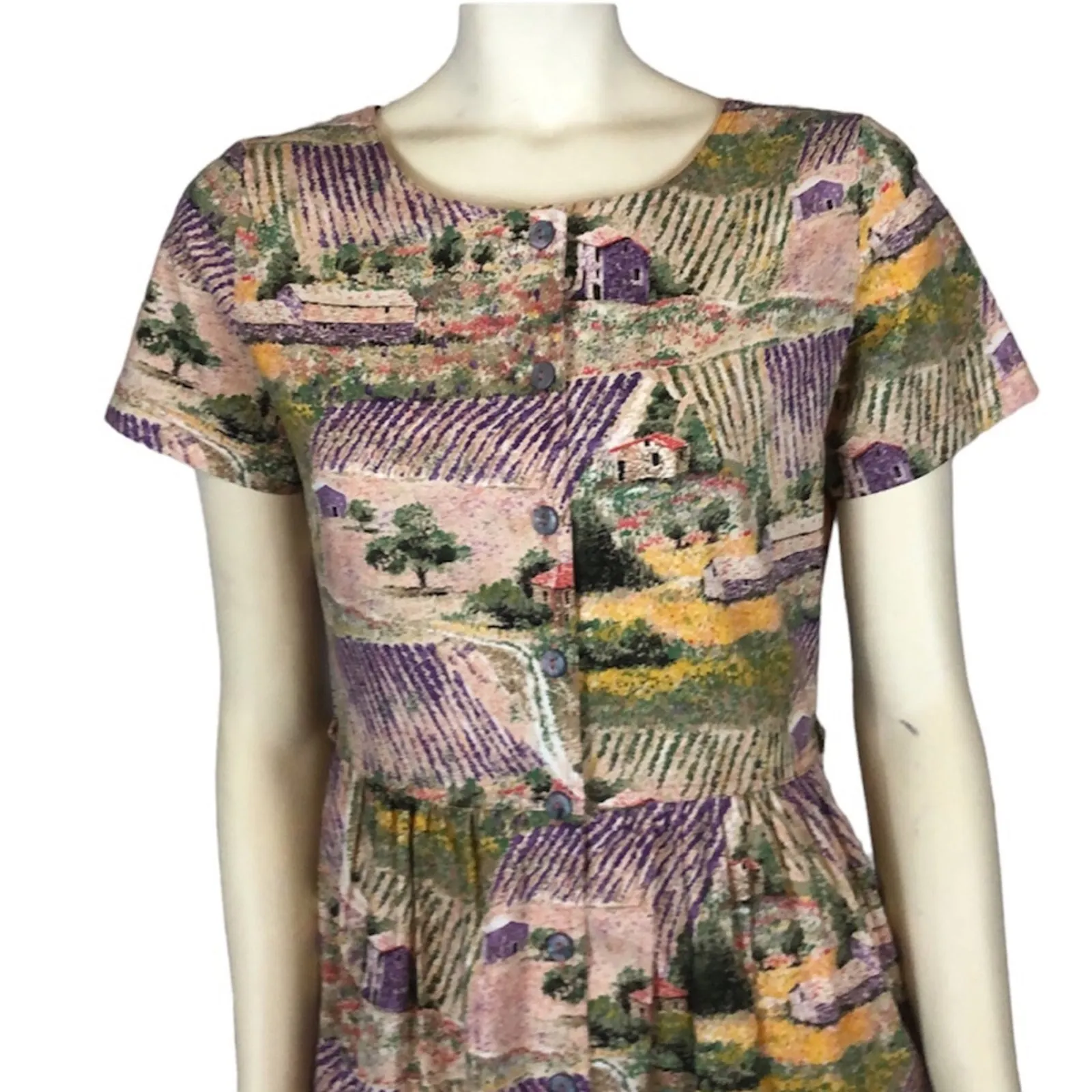 Beautiful 1990s “Designs by Margaret” maxi dress featuring an artistic scenic countryside print in s... Show more