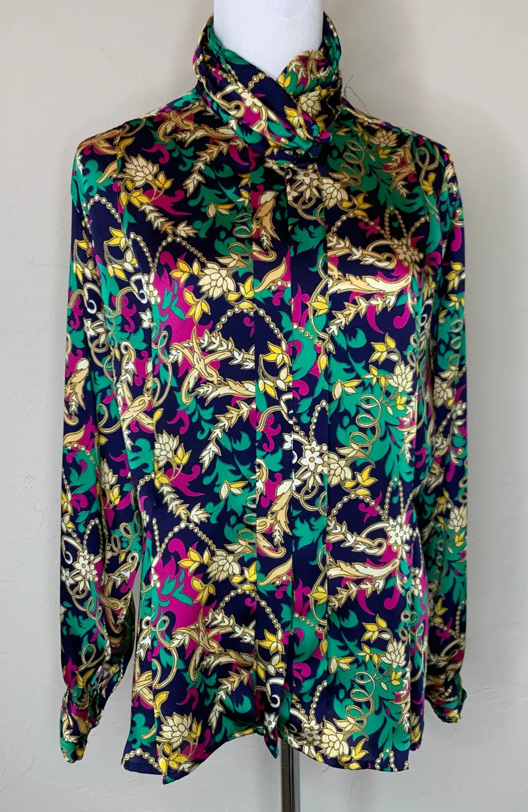 90s Rich Floral Regency Print Dark Blouse Sz 10 brand is Christie & Jill Bright green, pink navy blu... Show more