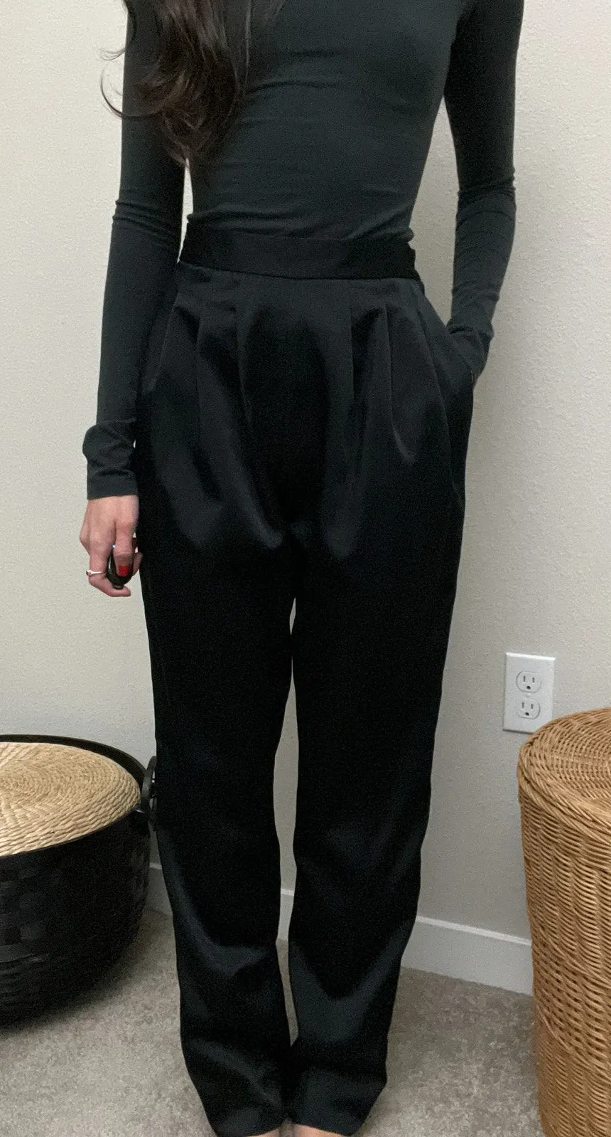 90s vintage black satin minimalist high waisted rise pleated front trousers pants by am pm 25" waist great condition, minor fabric wear waist 12.5 hips 19 rise 13.5 inseam 29 c12