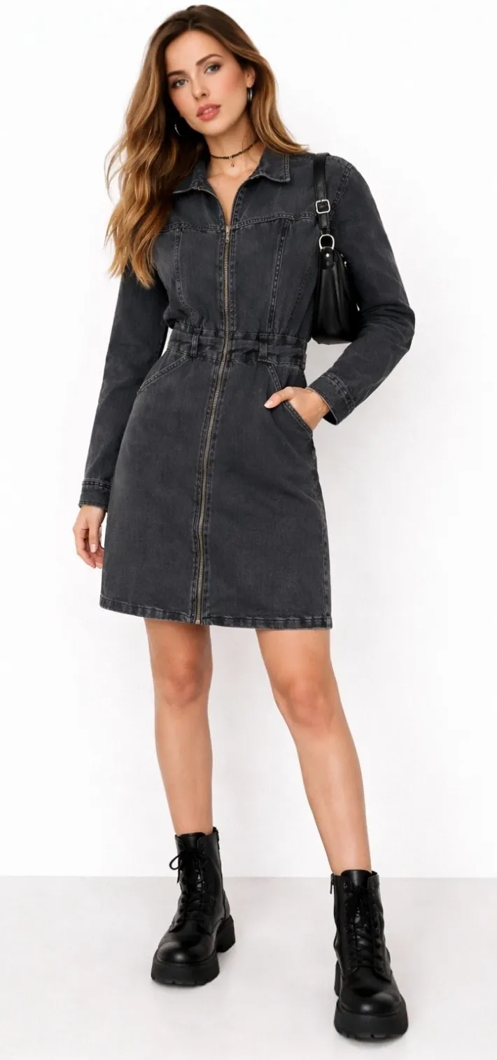 •Topshop denim dress, black washed denim, zip front dress, womens mini dress, UK10 dress, US6 dress, 90s fashion dress, Y2K denim, grunge dress women, high street fashion, casual day dress, pocket detail dress, belt waist denim, vintage inspired, spring summer dress, transitional fashion, British brand dress
