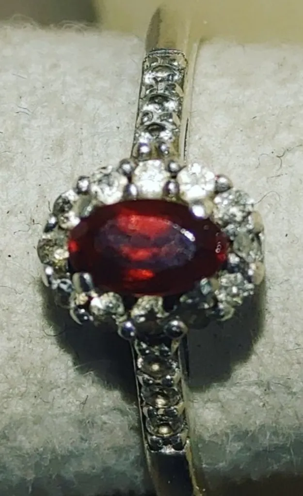 This vintage sterling silver ring showcases a radiant red oval gemstone encircled by a halo of sparkling accents. An elegant and timeless piece. • Stamped 925 for sterling silver authenticity • Intricate halo design with stone accents • Oval-cut red gemstone centerpiece • Band features delicate detailing Minor surface scratches on the band. Top to bottom of gemstone = 7mm. Ring size = 5 ~Buyer Please Note ~ All items are professionally cleaned and ozone-sanitized before shipping, which may leave a light temporary scent. Most listings are pre-owned — Please feel free to request any additional details before purchasing. I respond quickly to all inquiries. Reasonable offers are always welcome.
