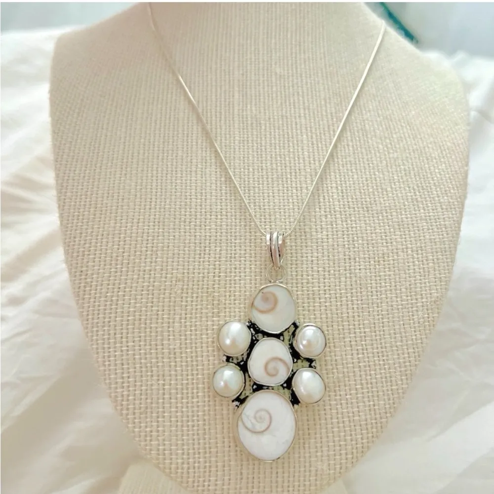 BRAND NEW! Elegant Shiva Eye Shell & Pearl Pendant Necklace 925 Sterling Silver women’s Jewelry SIZE: 18” *** With a Velvet Pouch and a cleaning clothing Ready for a gift. This elegant pendant necklace features natural Shiva Eye shells and lustrous pearls, set in polished sterling silver. Each spiral shell displays a unique pattern formed by the sea, symbolizing spiritual insight, intuition, and protection. In many coastal traditions, the Shiva Eye shell (also called Pacific Cat’s Eye) is believed to ward off negative energy, bring clarity, and connect the wearer to oceanic calm and balance. The pearls enhance this energy, representing purity, wisdom, and emotional harmony. Tags: shiva eye pendant, shiva shell necklace, operculum jewelry, ocean jewelry, sea shell pendant, protection amulet, spiritual jewelry, pearl pendant, beachy necklace, boho coastal jewelry, seaside vibes, handmade silver necklace, energy protection stone, natural shell pendant bohemian, coastal, ocean-inspired, spiritual, nature-inspired, elegant, beach chic, minimal, handmade, symbolic