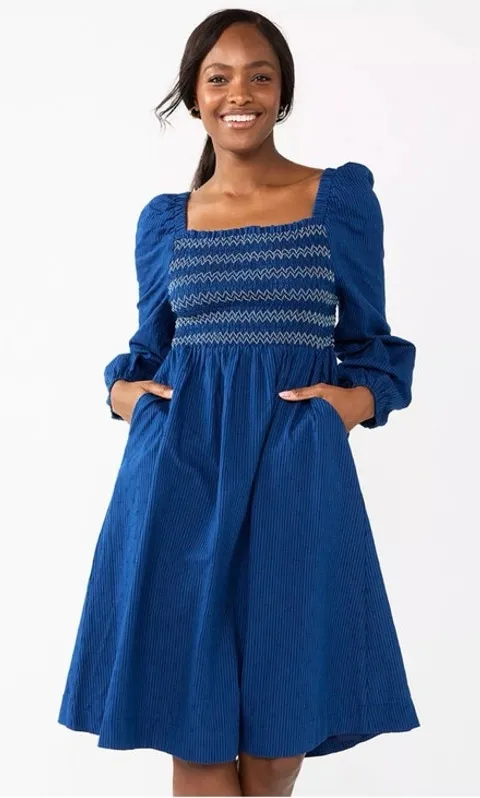 Draper James RSVP long sleeve dress in navy with smocked bodice and square neckline. Features side p... Show more