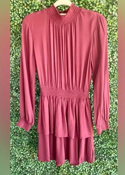 From Revolve. The high-neck smocked dress from Bobi BLACK is one of our favorites. Featuring a flattering fit, long sleeves, and a length that sits right above the knees, this dress is perfect for any special occasion, especially with holidays coming. Pair with your favorite pair of heels or booties. Has a smocked stretchy waist, as well as on the sleeves and neck. It is a very flowy & stretchy dress with 2-tiers. Complete with a two button neck closure with stretch. It is in a woman’s size medium. This is from the brand Bobby, Los Angeles, this is the label black, which is the higher end label. Do you have any questions or would like more photos? Please don’t hesitate to ask.!