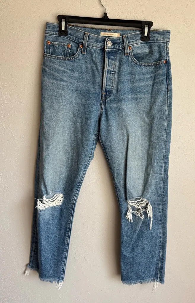 Levi’s Premium Mid Wash Blue Denim Wedgie Straight Leg Jeans Womens 29 Distressed Good condition,... Show more