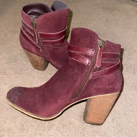 Stylish leather belts wrap the ankle of a trend-right bootie shaped from buttery-soft suede and lift... Show more