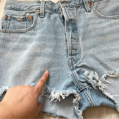 Levi's 501 High Rise Button Fly Cut Off Denim Shorts in Light Wash in the color blue. High rise. But... Show more