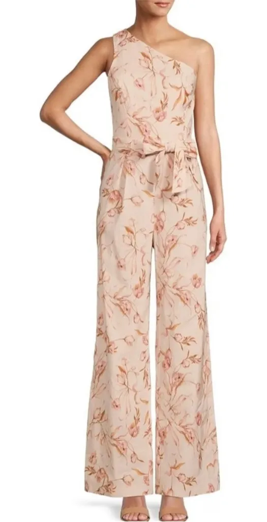 Chic one-shoulder jumpsuit with floral pattern. Soft blush tones. Ideal for stylish outings like a g... Show more