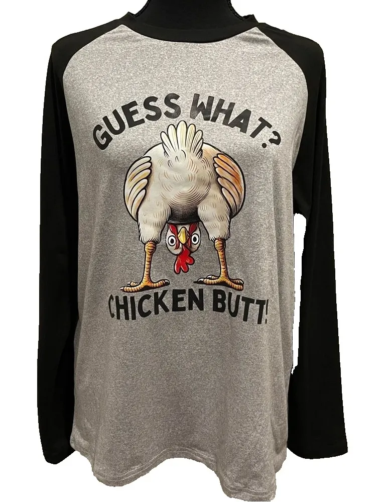Funny long sleeve tee with "Guess What? Chicken Butt!" graphic. Gray body, black sleeves. Available in Small, Medium, and Large. Great gift or conversation starter. Ships fast from Nashville. I have this tee in Small, Medium, Large and XL NWT