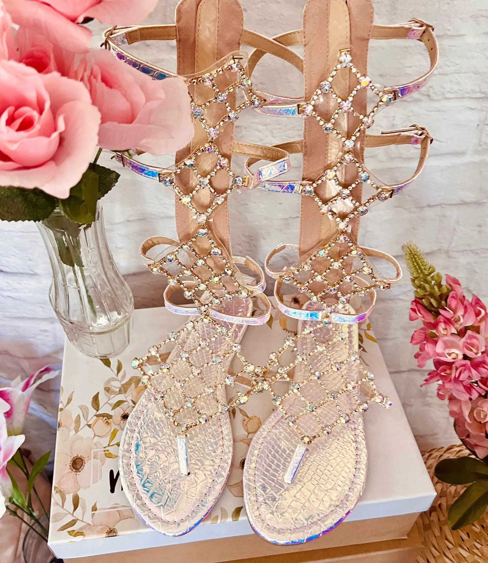 š Item: Gladiator Sandals š Brand: Vigo Fiore š Size: 7 š Colour: Pearlescent Holographic š Features: Reptile Print, Zipper Back, Sparkling Jewel Detailing On The Front, Holographic Design With A Pearlescent Finish š Material: All Man Made Materials š Shipping: Free š Condition: New, Never Worn. No Flaws š Measurements: - Shaft Height: 13ā