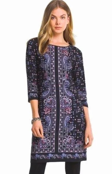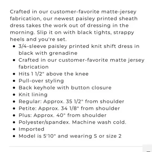 White House Black Market 3/4 Sleeve Paisley Print Knit Sheath Shift Dress. Pretty black matte sheath... Show more
