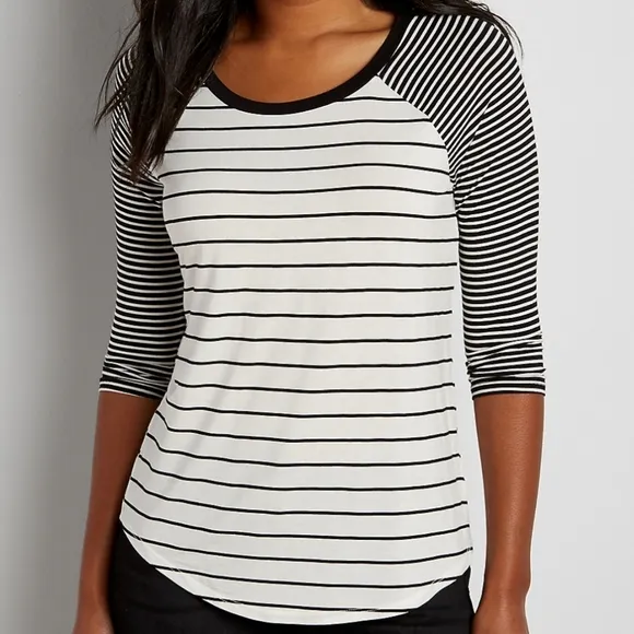 3/4th length sleeve tshirt. white body with black stripes and black sleeves with white stripes. scoo... Show more