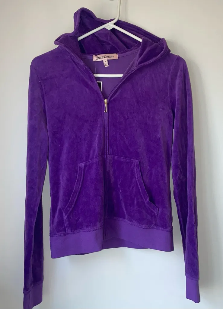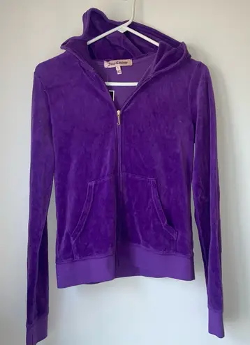 Stylish purple velour hoodie by Juicy Couture. Features a zip-up front and cozy hood. Plain, no desi... Show more