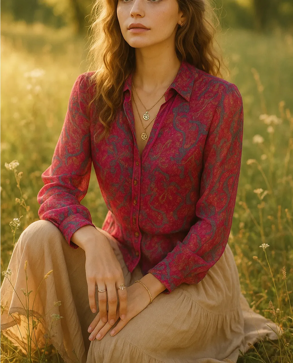 The Vintage Coldwater Creek Button Front Top in PXL is a charming pink paisley silk top with a collared neckline and long sleeves. Perfect for casual occasions, this top features a button closure and a lightweight, lined design. With a bohemian and fairy theme, this top is ideal for those who love the whimsical and romantic styles. A lovely addition to any woman's wardrobe, this top exudes a vintage charm with its classic design and unique character. Excellent preowned condition - no rips, stains, or tears. From a smoke free, pet friendly home. Approximate measurements in photos. Seller Notes: -Same/Next Business Day Shipping -Smoke Free & Pet Friendly Home