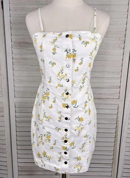 Gently used sleeveless sundress in white denim with yellow floral design. No fabric content or size... Show more