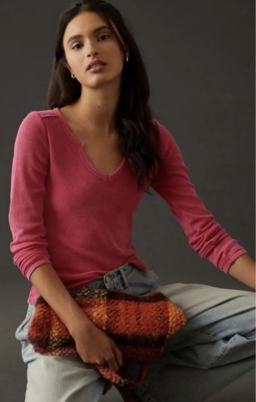 Anthropologie Pilcro Women’s Size XS Pink Notched Waffle Knit Top Long Sleeve V Neck Cotton Po... Show more