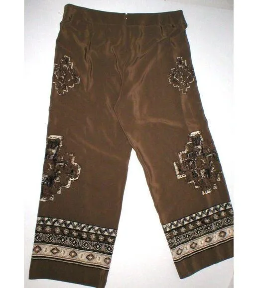 Worth New York Toffee Natural Monotone Ethnic Border Crepe De Chine Silk Sienna Pants Brown and white with black and tan accents An eye-catching, wide leg pant features a geometric print with a tribal vibe. Cut from 100% silk, these fluid ethnic print pants are equally bold and comfortable. Keep it in focus with a solid top, great for the office. Wear as casual pants or dress them up with flats or heels Size 4 inseam is 32" so these are great if you are tall or wear heels. These are very pretty and they are not lined. MSRP $498 Made in USA