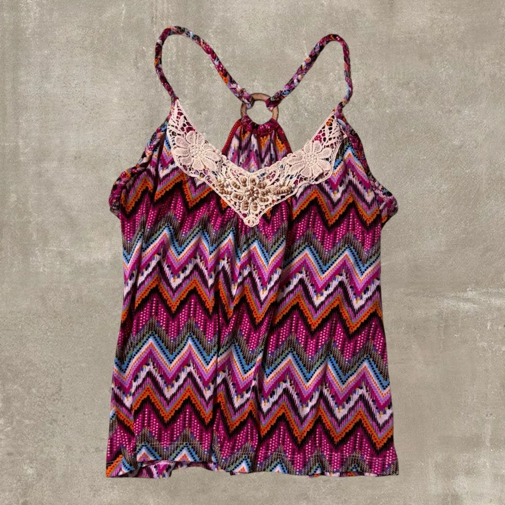 No Boundaries Zigzag Beaded Halter Tank Boho Y2K Festival Top colorful zigzag print, braided halter... Show more