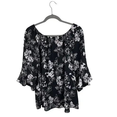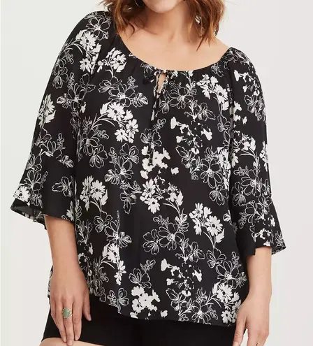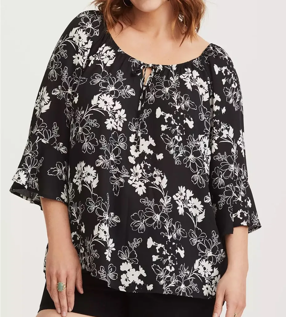 Torrid Floral Bell Sleeve Georgette Blouse Black and white florals enliven a bell sleeve blouse wit... Show more