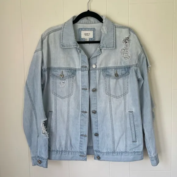 Forever 21 Denim jean jacket Size small, runs big Lightwash Distressed holes Pockets Button up Cotto... Show more