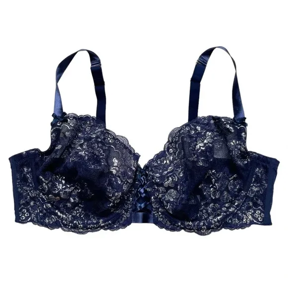 An unlined balconette bra in scalloped navy lace with silver metallic threading detail and crisscross straps between the cups. Satin bow accents offer a sexy finishing touch. Medium coverage. Fabric: 73% Nylon, 18% Spandex, 9% Metallic Women’s Size 44DD (E) In Excellent Condition
