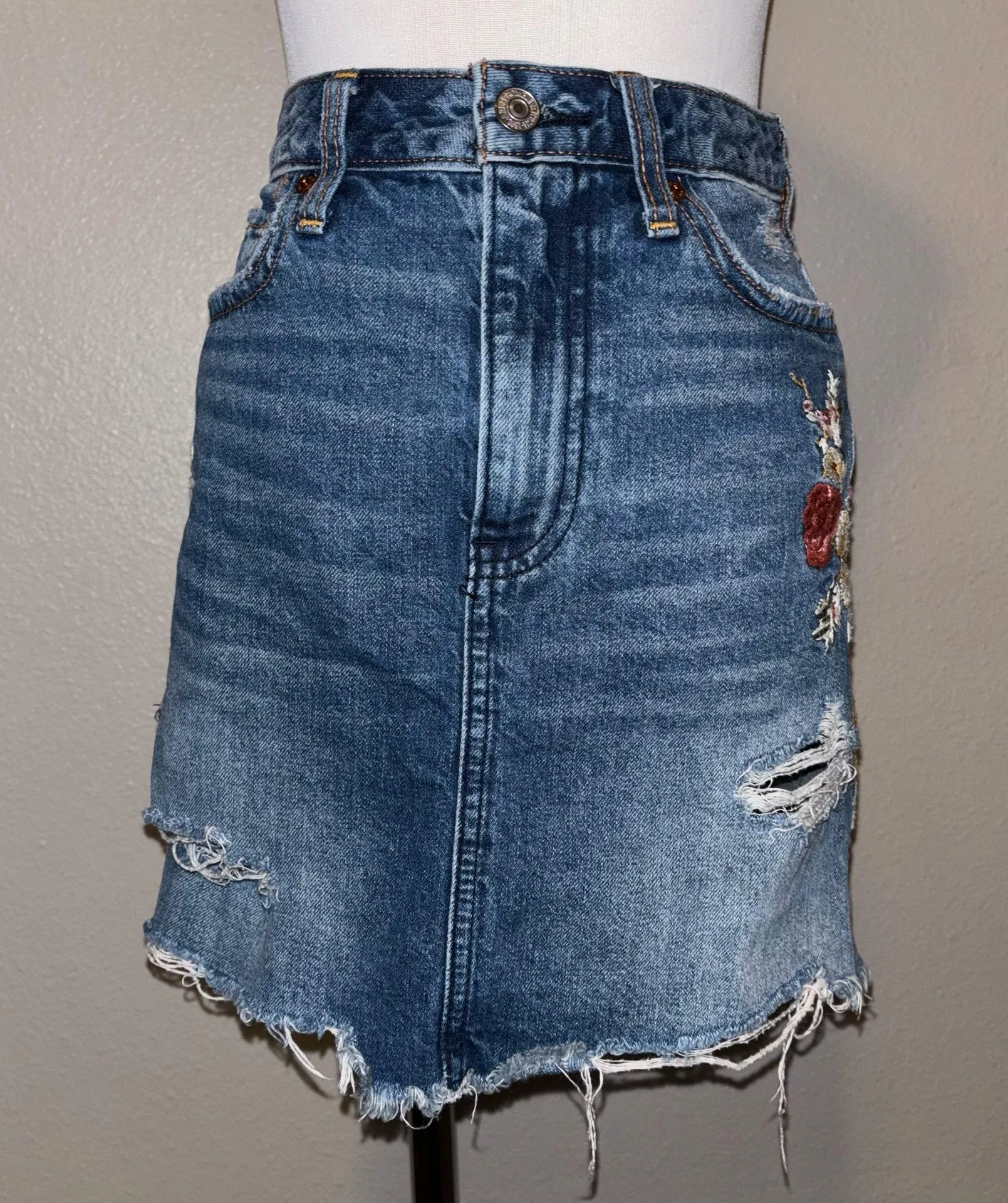 Size 25 | distressed a-line mini skirt | embroidered details on sides | raw hem | only worn a few ti... Show more