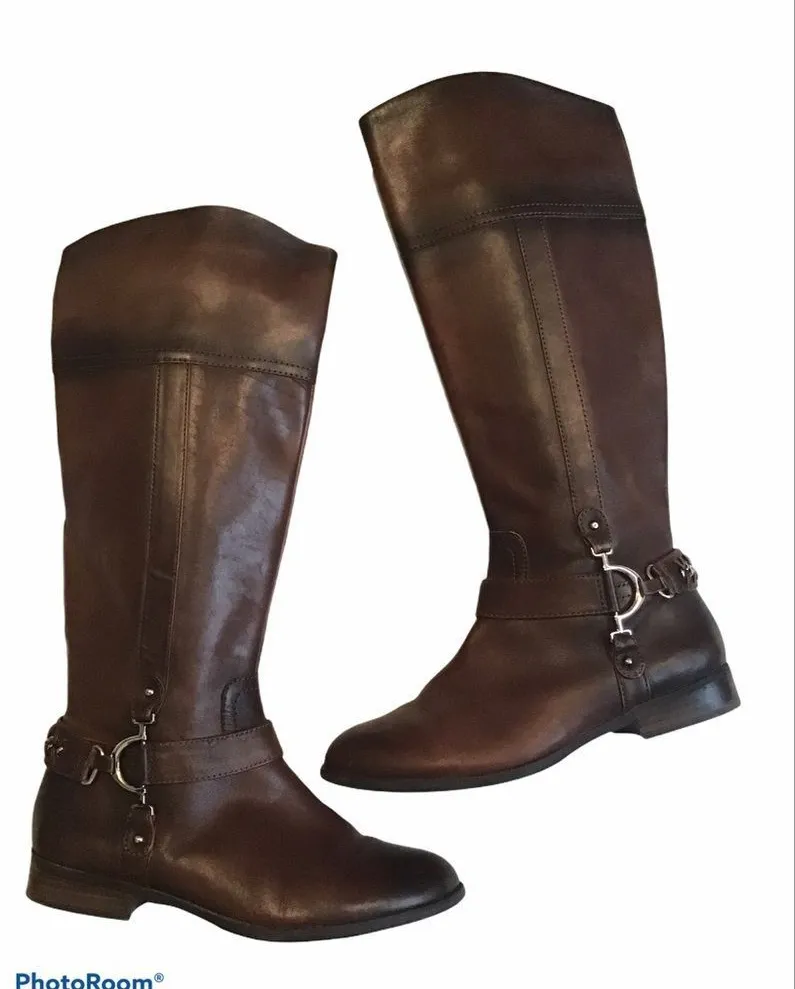 Alex Marie Taylour Leather Riding Boot. Has harness strap with rear chain detail and gold tone hardware. Full zipper on interior boot. Dark brown chestnut color. Size: 9 Heel height: 1” Shaft height: 15” (in the back) Pre-owned, good condition except right heel has a chip on interior part and there is a very small heel area with tiny gap. Heel is very much attached despite this. Purchased here on Curtsy. Love the boots they are beautiful and in extremely good shape. Previous owner shined th prior to buying. They are just too tight and can’t wear. My loss your gain:)