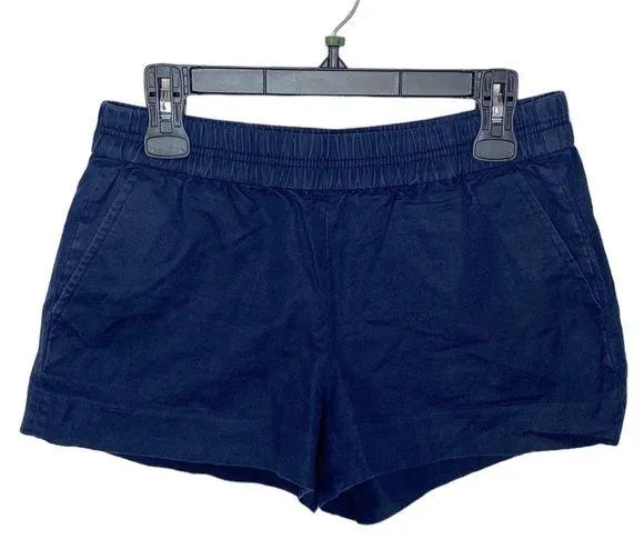 J Crew Factory navy linen blend boardwalk pull on mini shorts 3” inseam Good used condition, size 4 These cotton linen blend pull on shorts with elastic waistband are lightweight, breezy, and comfortable - perfect for your next beach vacation. Pull on style Mid rise Elastic waistband Mini silhouette Side pockets 55% linen 45% cotton Measured flat: Waist 14.25” Rise 9.5” Inseam 3” Note mild wear at edges 5.0