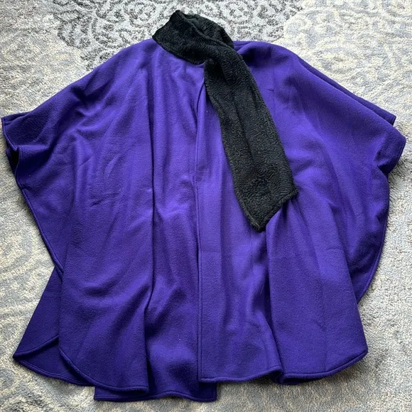 Vintage Specialty House Cape Poncho Coat With Faux Fur Trim Purple One Size Excellent condition Purple poncho cape with black faux fur trim attached collar scarf Velcro neckline closure