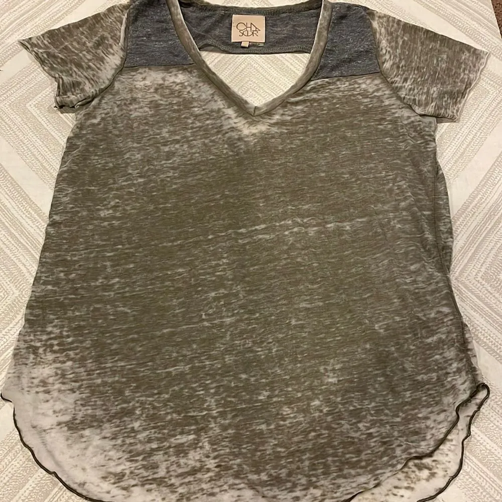 Chaser Women’s Grey/Army Green V Neck Open Back T-Shirt. Very thin material. Uncut hem on arms. A li... Show more