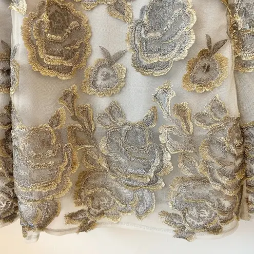 BHLDN Hitherto Eleanor Lace Dress; excellent condition, only worn once Sophisticated and stunning, metallic blooms glisten like a rain-kissed garden in the sun. Back zip closure Midi length Crew neck Sleeveless Lace detail Fully lined Color: taupe, neutral with gold metallic Approximate measurements: Chest: 36" Length: 47" Shoulder width: 3.5" *This item may tagged with a security ribbon and unique ID number to prevent fraudulent returns. It can easily be removed with scissors. Once the ribbon is removed, the item will no longer be in the same condition as it was sent. Additional photos and video of packaging process may be taken prior to shipment. Tags: Special occasions, bridesmaid, mother of the bride, occasion, event, mother of groom, party dress, elegant, formal, wedding, evening, evening wear, cocktail, lace, glam