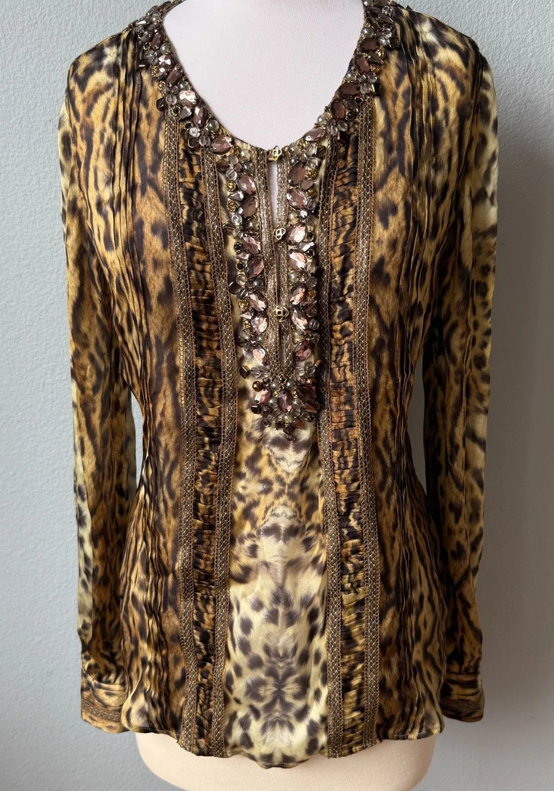 The very best blouse ever! This stunning animal printed silk chiffon blouse designed by Oscar de la Renta has a lavish collar and bib front hand sewn with layered jewels in all shapes and sizes and many beautiful colors. This design element is repeated on both sides of the center front with horizontally gathered silk chiffon in the center. There are four pin tucks on the left and right sides to complete the design of this amazing blouse. The blouse has a three button opening at the center front and it slips on over your head. From 2009 Material tag was cut out, but it made from silk No missing beads, in great condition Size was removed, but I would say best for a size medium, please follow the measurements below Measurements laying flat | Pit to pit | 19" Length | 25"