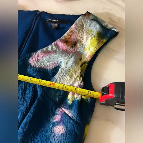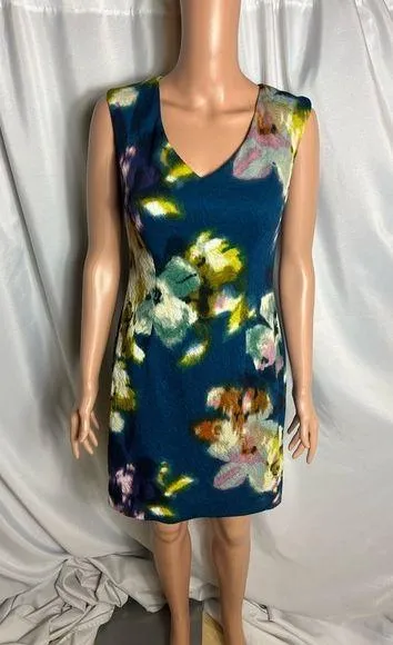 Elegant and vibrant sleeveless floral sheath dress by Maggy London, featuring a v-neckline, back zipper, and textured fabric with abstract floral print. Size 12 (EU 38), approx. 33” length. Lined and beautifully structured—perfect for weddings, brunches, or office wear. Style Tags: #MaggyLondon #SheathDress #FloralDress #WeddingGuest #VNeckDress